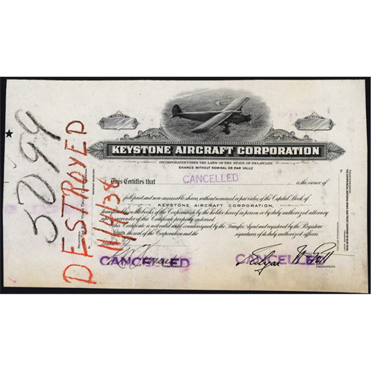 Pennsylvania. ND (ca.1926), Odd Shares, Proof stock certificate of title, text and vignette with no borders. Purple “Cancelled “ hand stamps. Vignette of early tri-motor mono-plane. VF condition with archival notations in crayon listing status of printing plate. Rare certificate found in this format only, no specimens or issued certificates available. Extremely rare early aviation certificate. Founded in 1926, it was taken over in 1929 by Curtis-Wright where it was part of their manufacturing division and was closed in 1932. Historic aviation certificate, 2 found in archive. Republic BNC.