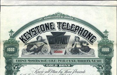Pennsylvania. 1905. $1,000. Specimen 1st Mortgage 5% Gold Bond. Green border. Seated allegorical boy and girl with "Keystone" shaped stone between them. Coupons attached. Red specimen overprints, POC's and "00000" serial numbers. XF condition. Rare Telephone bond. IBNC