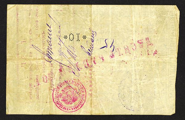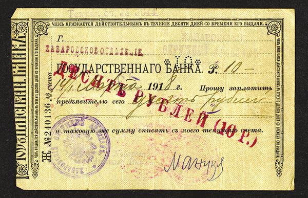 Russia (Siberia & Urals), government bank circulating check for 10 Rubles, P-S1225B, diagonal handstmp in words and numbers, perforated "10", hand signed and dated 1918, also has official Khabarovsk branch seal hand stamp, uniface, with endorsement signatures on back, Fine condition.