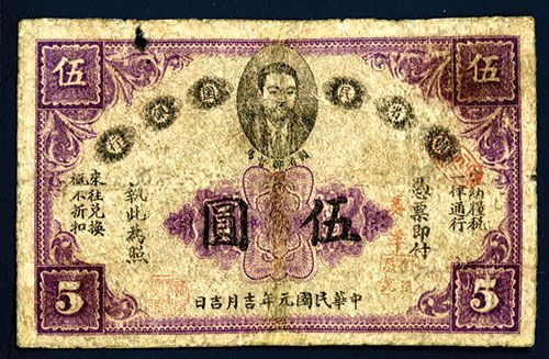 China, 1912, $5, P-S3900A (S/M#C97-2), Issued banknote, Black with brown border with portrait of General Ma Yu-Pao at top center, back green, VG to VG+ Condition, rarely seen Military note missing from most collections.