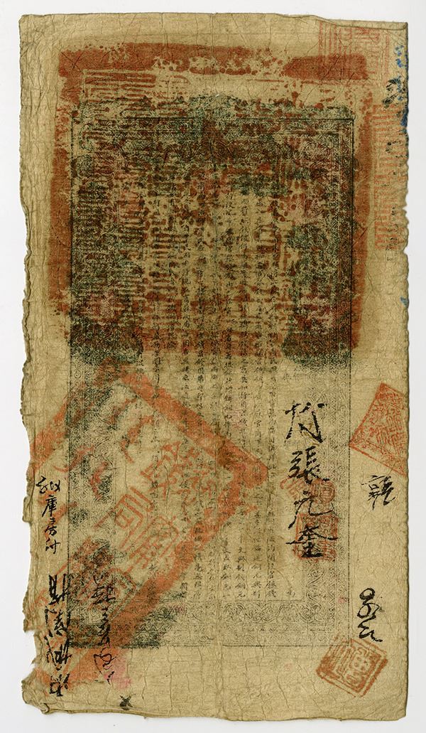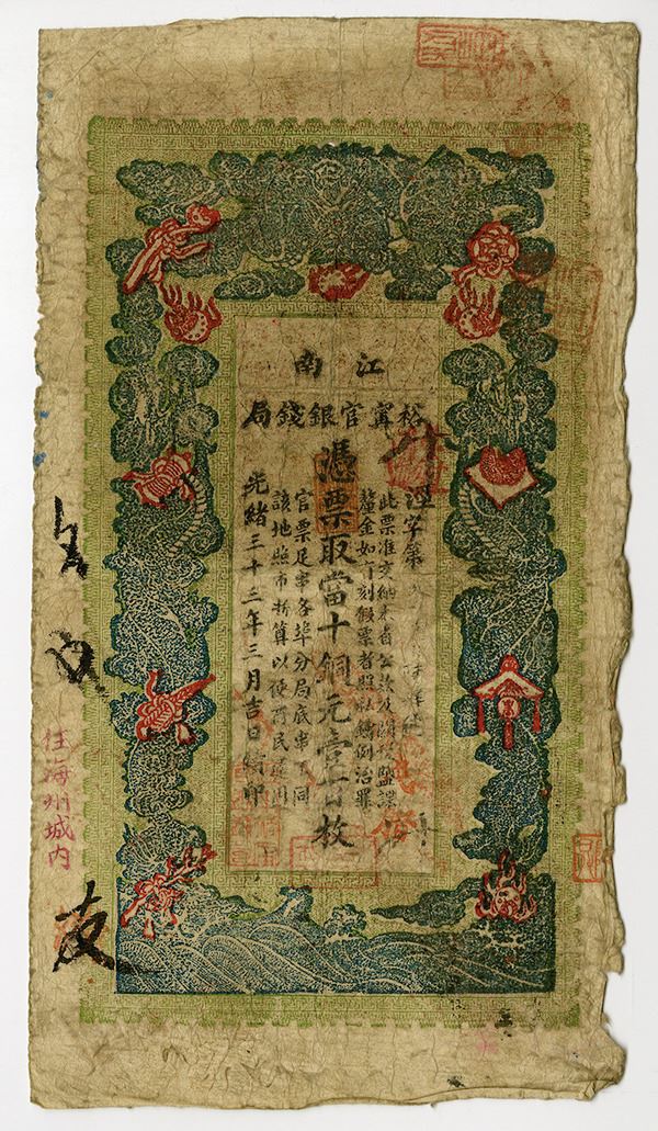 1903 (December) (Kuang Hsu 29th year), Ching Dynasty, Kiangnan Yu-Ning Government, Silver Note Bureau 100 coppers, P-S1174, (S/M #C107-23), Issued banknote, a moderately worn example, facing dragons on frame, back with red seals and faded frame, minor edge imperfections, Choice VG to Fine Condition, Very scarce in any condition.