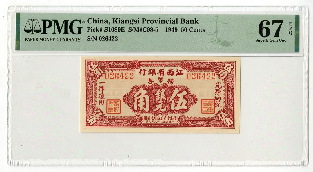 China, 1949. 50 Cents, P-S1089E S/M#C98-5, Issued Banknote, Red printing on front and back, S/N 026422, PMG graded Superb Gem Uncirculated 67 EPQ. Tied as highest graded with 6 others out of 566 graded in the PMG census. This will be impossible to improve upon.