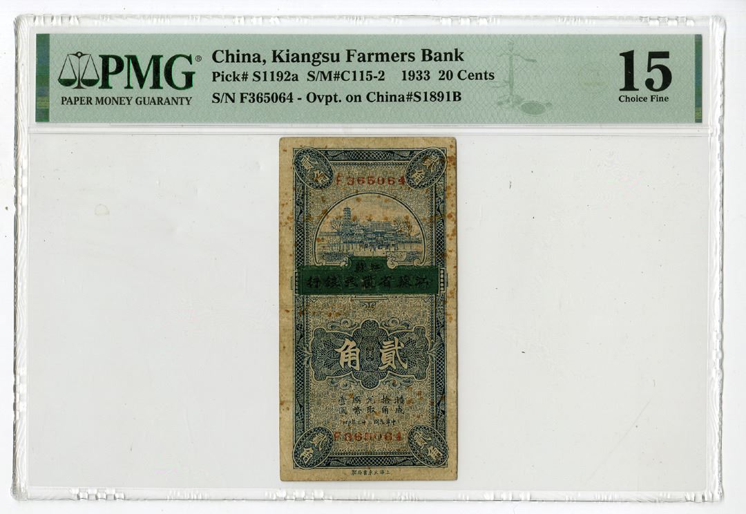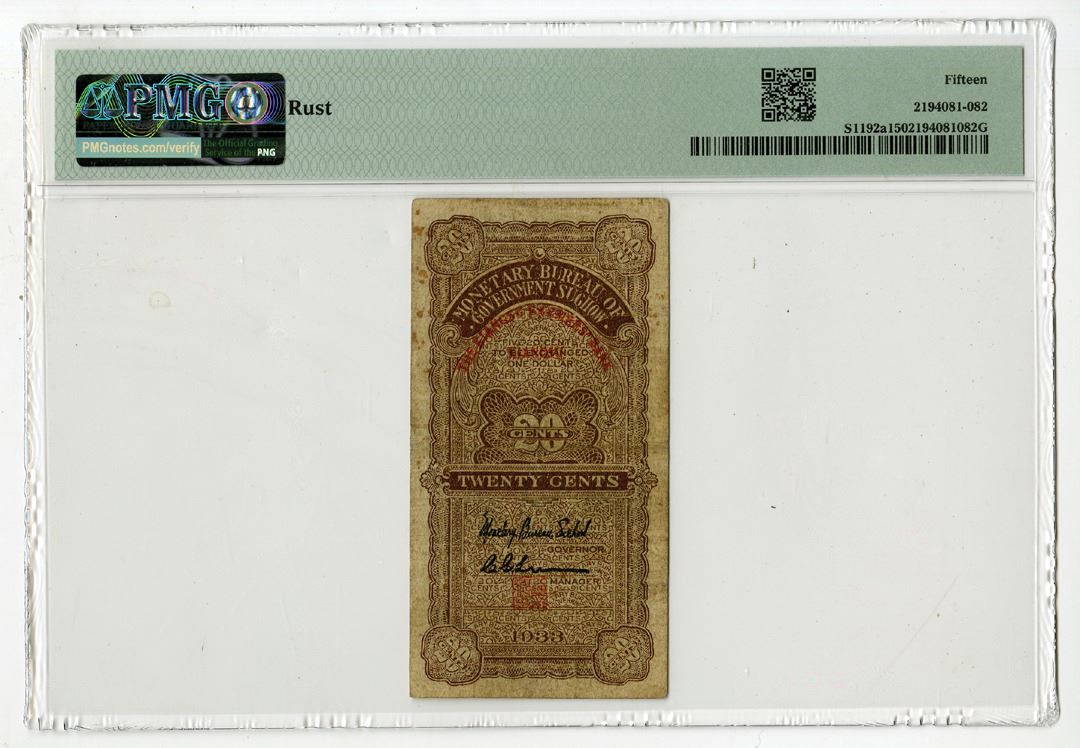China, 1933. 20 Cents, P-S1192a S/M#C115-2, Issued banknote, Dark blue print with temple at top, Note is overprinted on China #S1891B, S/N F365064, PMG graded Choice Fine 15 with comment "Rust." Only one example has been noted to be offered at auction in the T&P census.