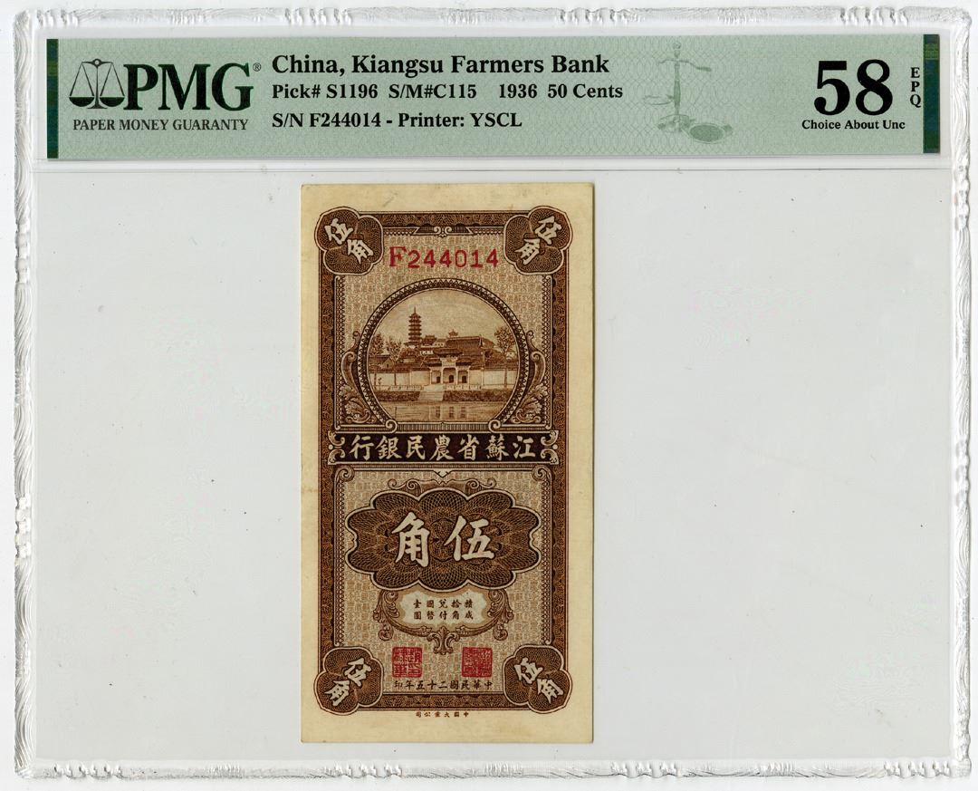 China. 1936. 50 Cents, P-S1196 S/M#C115, Issued banknote, Brown and light brown, S/N F244014, PMG graded Choice About Uncirculated 58 EPQ. Printer: YSCL.
