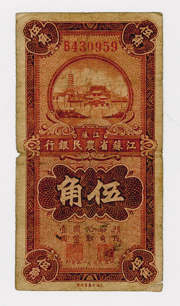 China, 50 cents, P-S1198, Issued banknote, brown on light brown, Pagoda on top middle, back dark violet, S/N B430959, Choice Fine to VF condition, attractive note.