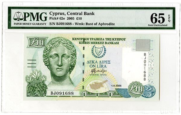 Cyprus. Issued 10 Pounds, 2005, P-62e, PMG graded Gem Unc 66 EPQ.
