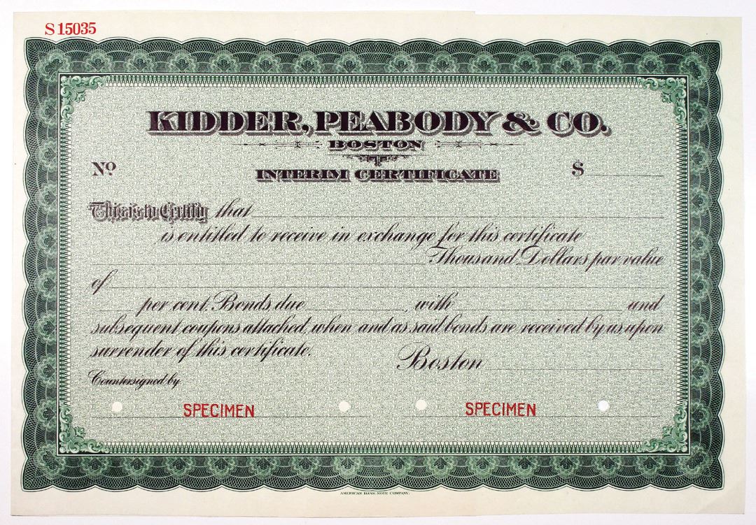 Massachusetts. ND (1900-1920s). $Odd Specimen Interim Certificate, Black text with green border and background. Red specimen overprints and POCs. VF condition, ABNC. Kidder, Peabody & Co. was an American securities firm, established in Massachusetts in 1865. The company's operations included investment banking, brokerage, and trading. (John E. Herzog Collection)