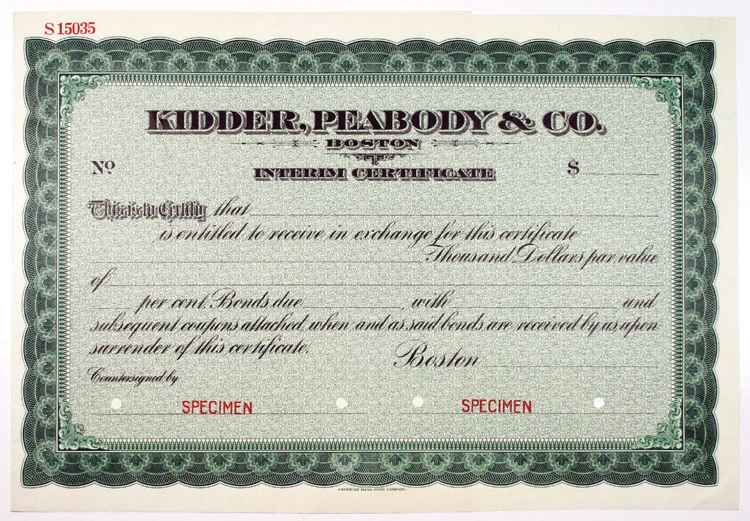Massachusetts..... ND (1900-1920s). $Odd Specimen Interim Certificate, Black text with green border and background. Red specimen overprints and POCs. VF condition, ABNC. Kidder, Peabody & Co. was an American securities firm, established in Massachusetts in 1865. The company's operations included investment banking, brokerage, and trading. (John E. Herzog Collection)