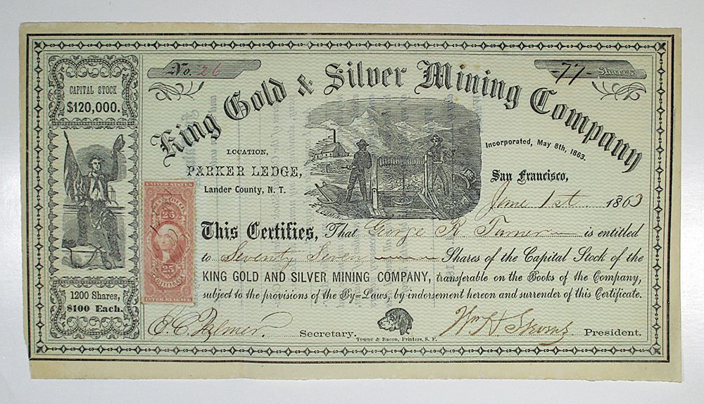 Lander County, Parker Ledge, Nevada Territory, (Offices in San Francisco, California), June 1st, 1863. 77 Shares I/U Capital Stock Certificate, S/N 26, Black text with black border on light green underprint, Men at work in mine at center with sailor at left. VF condition. Issued to George R. Turner, signed by Wm. H. Stevens as President, Towne & Bacon. Mines were located at Parker Ledge in Lander County, Nevada Territory. Rare and early Nevada Territorial stock certificate from a new find.