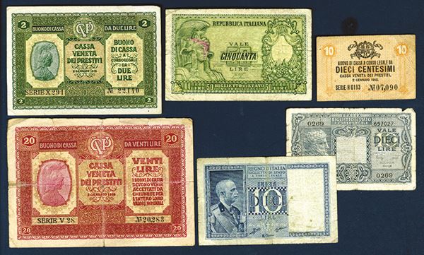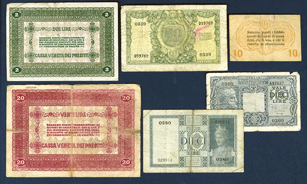 Italy. Cassa Veneta dei Prestiti, 1918, 10 Centesimi, 2 and 20 Lire; Biglietto di Stato P-25b; 32; 91a. Generally Very Good to Fine. The 20 lire with some repairs at quarter fold. 6 pieces.