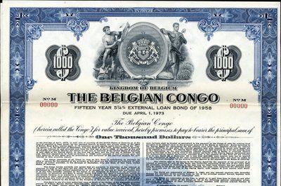 1958. $1,000. Kingdom of Belgium "The Belgian Congo" Specimen 15 Year, 5-1/4% External Loan Bond of 1958. Blue border. Belgium Arms flanked by allegorical white and black men. Bond is in English. Red specimen, "0000" serial numbers and POC's. Coupons attached. Rare Belgium Colonial bond. ABNC.
