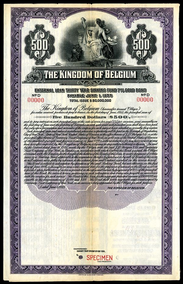 Kingdom of Belgium, 1925 Specimen External Loan 7% Gold Bond. Belgium. June 1, 1925, $500, External Loan 30 Year Sinking Fund 7% Gold Bond. Purple border and undertint. Vignette of kneeling and topless allegorical woman holding grapes. Written in English. Specimen overprints, "00000" serial numbers and POC's. Fine condition with archivally reinforced splitting at vertical fold. Coupons attached. ABNC. Rare bond.