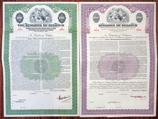 Belgium. Lot includes 2 pieces: 1954, $1000 Specimen 4% External Loan Sinking Fund Coupon Bond in green; 1959, $1000 Specimen 5.25% External Loan Sinking Fund Coupon Bond in purple. Both have red specimen overprints, 00000 serial numbers, and POCs. Both are in VF condition, ABNC.