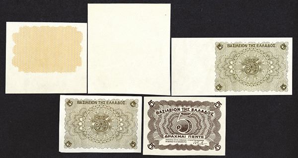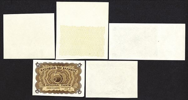 Greece. 5 Drachmai. P-321 for type. Face underprint and main print. Back underprint and main print, all uniface, the last two with a wide margin. Fully printed note but for serial #. All Uncirculated. 5 pieces.