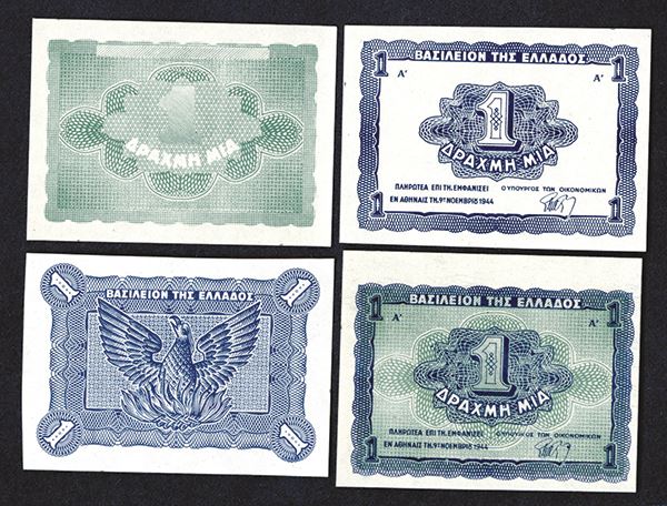 Greece. Drachma 1944. Uniface prints of face and back, with and without underprint, and separate. Uncirculated or better. Hand cut form sheet. 4 pieces.