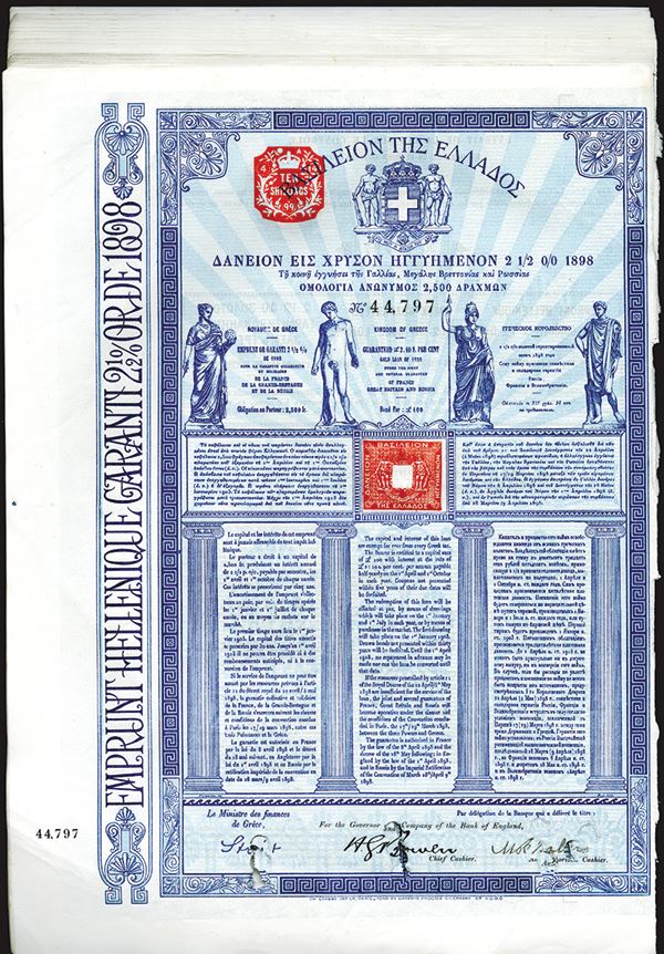 Lot of 23 certificates. Greece. All blue, Greek arms, four statues, four columns, square red seal, EF details, punch cancels through the signatures, and the right ends are a bit uneven. Very fresh and bright for the most part.