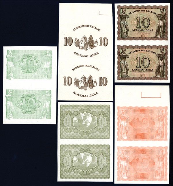 Greece, P-322 Unlisted Proofs. 10 Drachmai. 5 different Uncut progressive face and back proof pairs. Group includes one fully printed uncut banknote pair and additional progress proofs at various stages, AU to Choice uncirculated. Printed locally in Greece during the war.