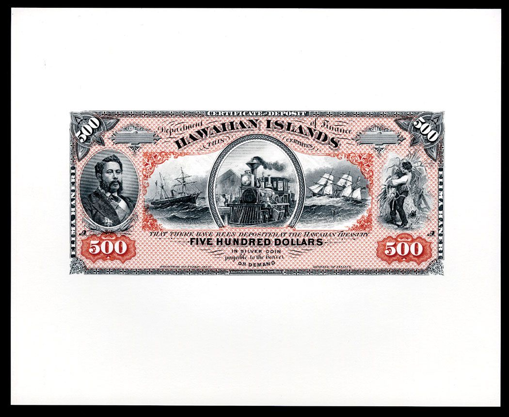 Hawaii, Lot of 5 Cards, 1995, Includes $10 to $500 denominations, faces with color undertinted banknotes with large blank border, back with ABNC endorsement, Printed from the plate of that printed the original notes, All in mint condition. This is the only way a collector can obtain an example of these extremely rare notes. This series was part of the American Bank Note Commemoratives issues. ABNC.