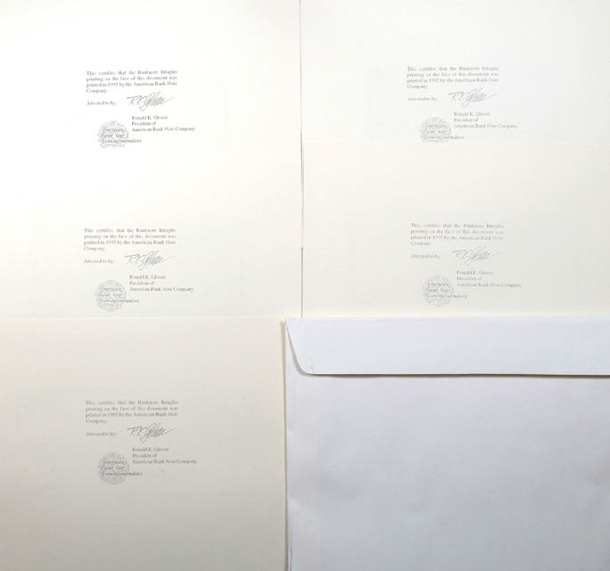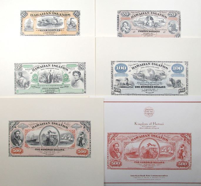Hawaii, 1879 (1995 Reprints). Lot of 5 Reprints from the original plates in 1995, Set Includes $10, $20, $50, $100, and $500 denominations, All are full color obverse proofs with ABNC attestation on back, Cards are in mint condition, Lot includes letter prepared by ABNC with information on the original printing of the notes, Lot also includes original envelope. (5). Sold "AS IS" no returns accepted.