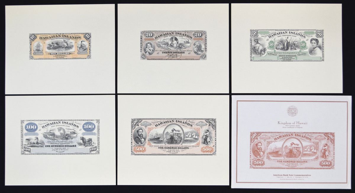 Hawaii, 1995 Reprints of 1879. Lot of 5 Cards reprinted from the original plates includes: $10, $20, $50, $100, and, $500 denominations, all are full color obverse proofs with color under tints with large blank border, back with ABNC attestation, Includes original envelope and ABNC letter with information about the cards, All in mint condition. (5). Sold "AS IS" no returns accepted.