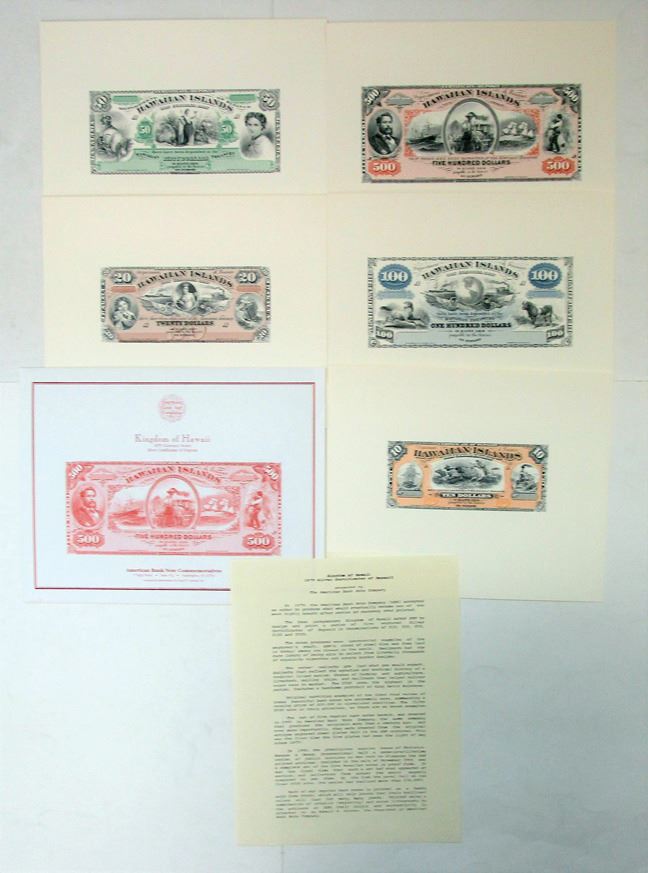 Hawaii, 1879 (Reprinted in 1995). Extremely attractive Group of 5 Proof Souvenir Cards featuring reprints of the American Bank Note Co.'s Silver Certificate of Deposit series, including: $10 with cowboy in orange; $20 with woman at center, brown; $50 with allegorical woman at center, green; $100 with a globe flanked by a ship and train, blue; and $500 with train at center flanked by ship scenes, red. All have the American Bank Note Company attestation that they are all intaglio printed in 1995 (from the original pates), All are in Gem Uncirculated condition as printed. Includes an accompanying sheet with details. (5)
