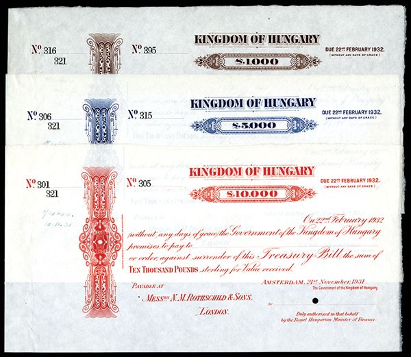 Kingdom of Hungary, 1931, Group of (3) Specimen Treasury Bills Hungary, Beautiful Group of (3) U/C Treasury Bills, 1,000, 5,000 and 10,000 Pound Sterling, (Brown, Blue Grey and Red) on Cream colored heavy bond paper, AU/ UNC.