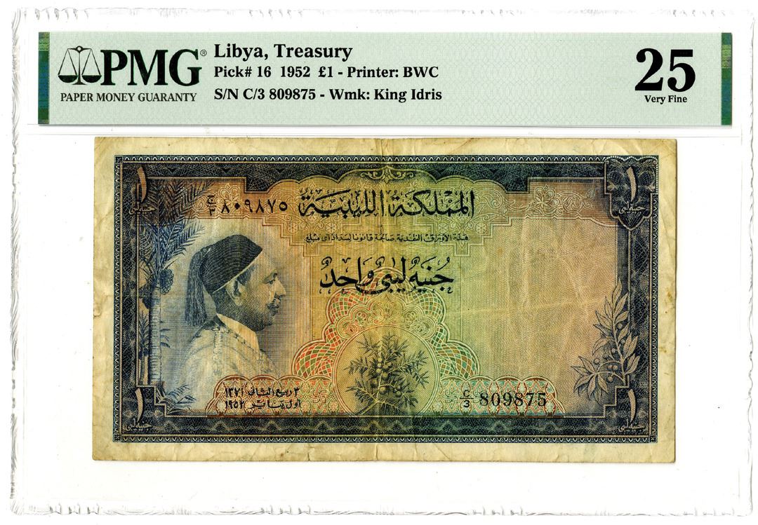 Libya. 1952. 1 Pound, P-16, Issued banknote, Blue, S/N C/3 809875, Watermark: King Idris, PMG graded Very Fine 25. Printer: BWC.