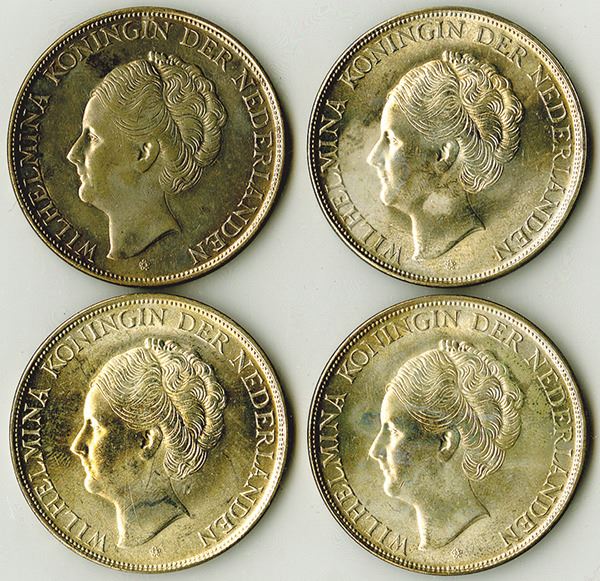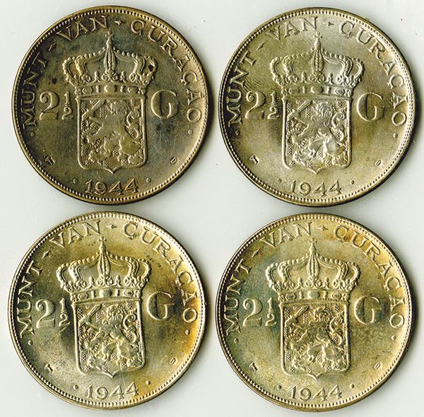 CuracaoÉ. Lot of 4 coins, All 4 are 1944 D, 2 1/2 Gulden, .720 Silver, 0.575 oz., 38 mm, mintage 200,000 with 60,000 melted after minting. Uncirculated to CU Condition. (4)