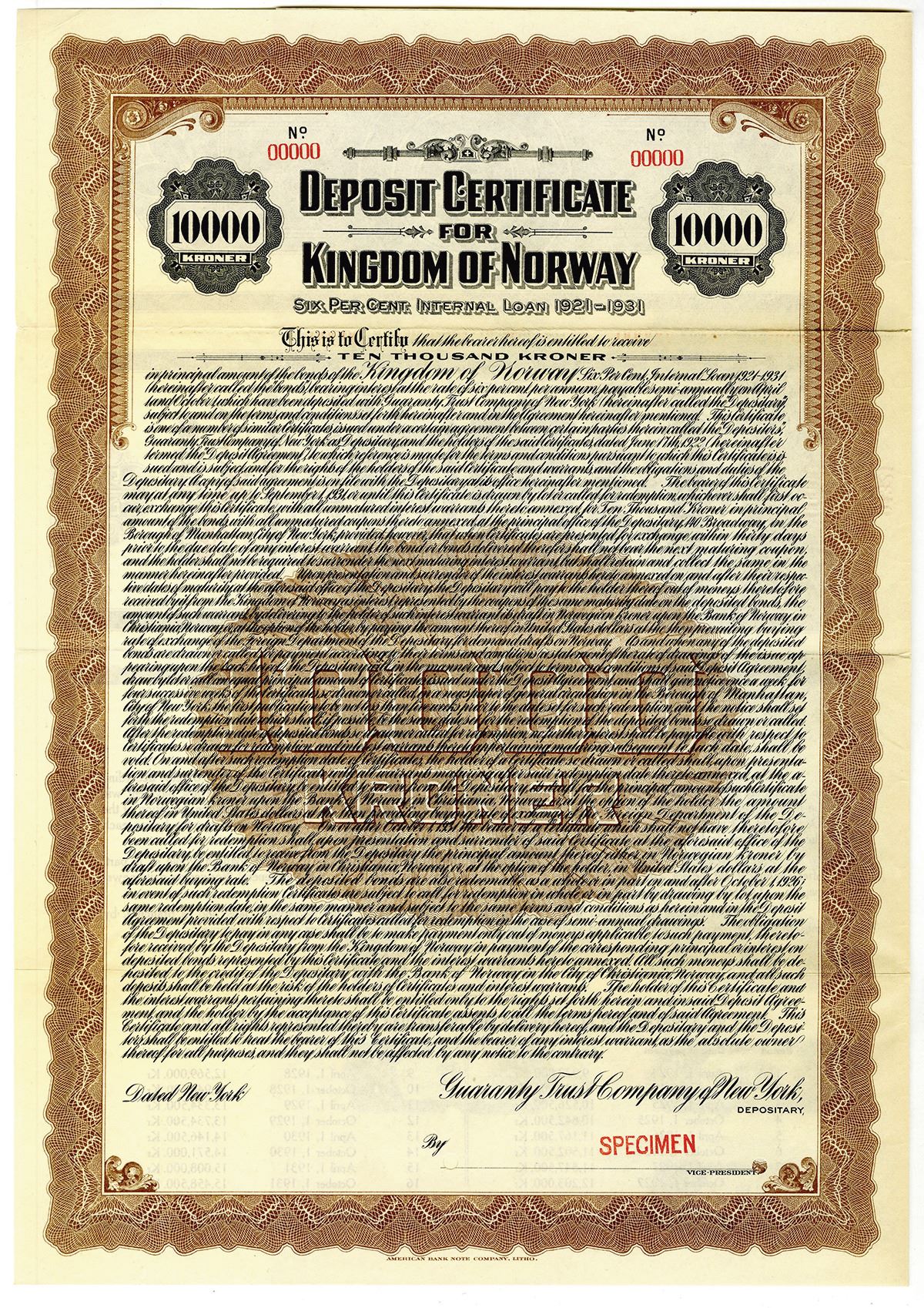 Norway,1921. 10,000 Kroner Specimen 6% Internal Loan Deposit Certificate with Coupons, Black text with brown border and undertint. Red specimen overprints, 00000 serial numbers, and POCs. VF condition, ABNC.