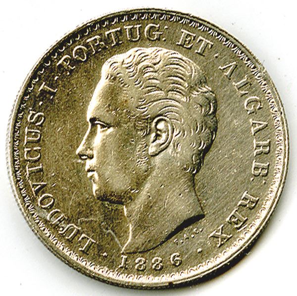 PortugalÉ. 1886, 500 Reis, Y#509, 0.917 Silver, 0.3685 oz, Ludovicus I Portrait, XF to Choice XF condition.