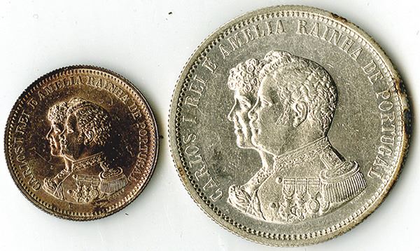 PortugalÉ. Lot of 2 coins, Both are dated 1898, Includes 200 Reis, Y537, 0.917 Silver, 0.1474 oz, and 1000 Reis, Y#539, 0.917 Silver, 0.7371 oz, Carlos I Ruler, Conjoined busts on obverse, XF to Choice XF condition.
