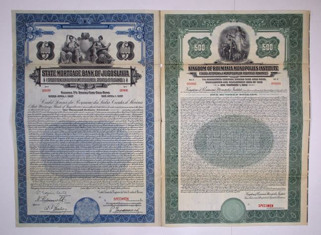 Romania & Yugoslavia, 1927-29. Pair of Specimen Bonds, Includes: Kingdom of Roumania Monopolies Institute $500 Specimen 7% External Sinking Fund Gold Coupon Bond, Black on green border and underprint with allegorical male and female at top; State Mortgage Bank of Jugoslavia $1000 Specimen 7% Sinking Fund Gold Coupon Bond, Black on blue border and underprint with allegorical woman and children at top. Both bonds have Specimen overprints and POCs, and both are in Fine-VF condition. ABNC. (2). Sold "AS IS" no returns accepted.