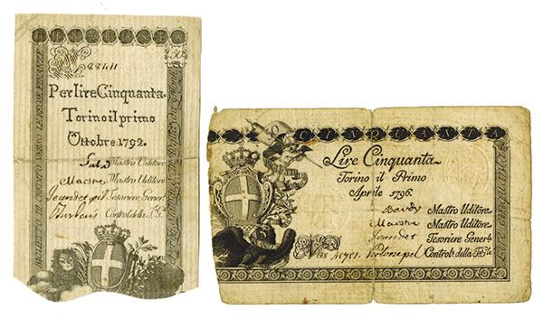 Italy, includes 50 Lire, 1 April 1796, P-S130a, Fine; and 100 Lire, 1 October 1792, P-S118a, Fine with splits repaired with tape on back.