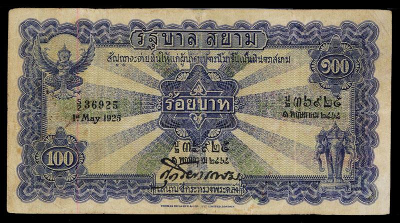 Kingdom of Siam / Thailand, 1925.Kingdom of Siam / Thailand, May 1, 1925. 100 Baht, P-20a TB31. Type 1 text, Issued banknote, Blue on green, winged Garuda on top left, tricephalic elephant symbol lower right, ceremonial procession, back. Signature 10. S/N S/2 36925, PMG graded Very Fine 20 NET, Repaired. TDLR. Rare early first year issue.
