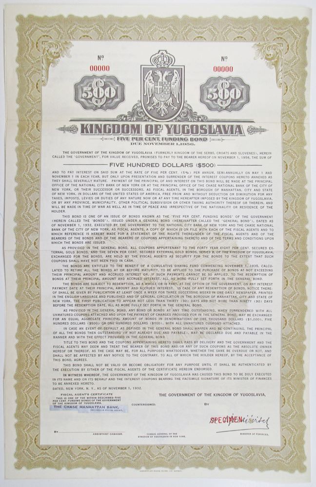 Yugoslavia, 1932. $500 Specimen 5% Funding Coupon Bond, Black text with brown border and undertint, Kingdom of Yugoslavia coat of arms depicted at top center. Red specimen overprint, 00000 serial numbers, and POCs. VF condition, ABNC.