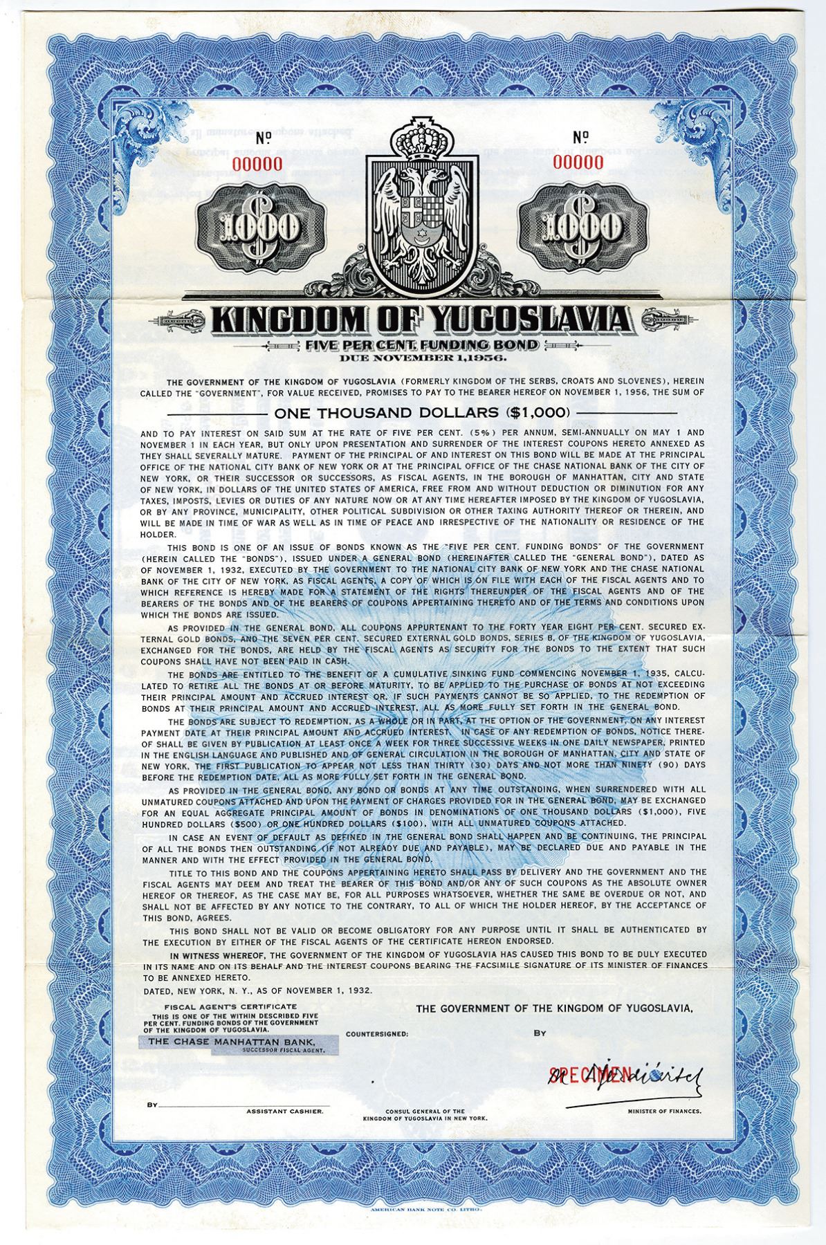 Yugoslavia, 1932. $1000 Specimen 5% Funding Bond, Black text with blue with blue underprint, Coat of Arms of Yugoslavia depicted at top center. Red specimen overprint, 00000 serial numbers, POCs. VF condition, ABNC.
