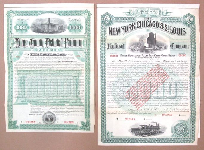Brooklyn, New York, 1885-87. Lot of 2 Specimen Bonds, Includes: Brooklyn, 1885, Kings County Elevated Railway Co. $1000 6% First Mortgage Gold Coupon Bond of 1885; and, 1887 (Reissued in 1937 with Going off the Gold Standard Clause), New York, Chicago and St. Louis Railroad Co. $1000 4% First Mortgage Gold Coupon Bond of 1887. Both have Specimen overprints and POCs and are in VF to XF condition. (2). Sold "AS IS" no returns accepted.