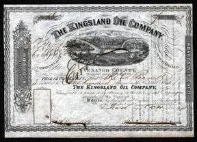 Philadelphia, PA. 1864. 100 Shs, issued and Pen cancelled stock. View of oil wells in lare oval in middle with ornate text. No revenue stamp attached. Cut close on sides with toning and pin holes, otherwise appears in VF condition. Scarce.