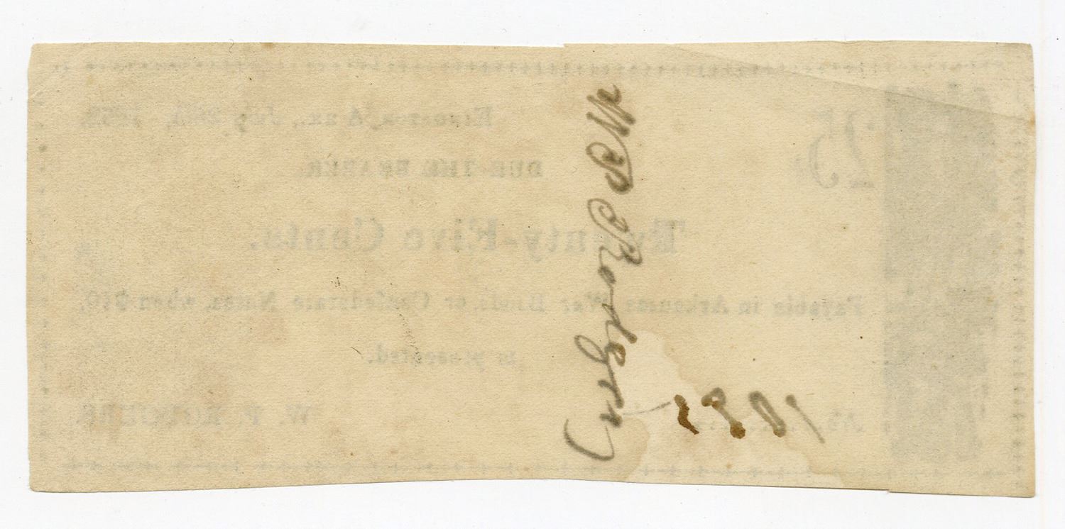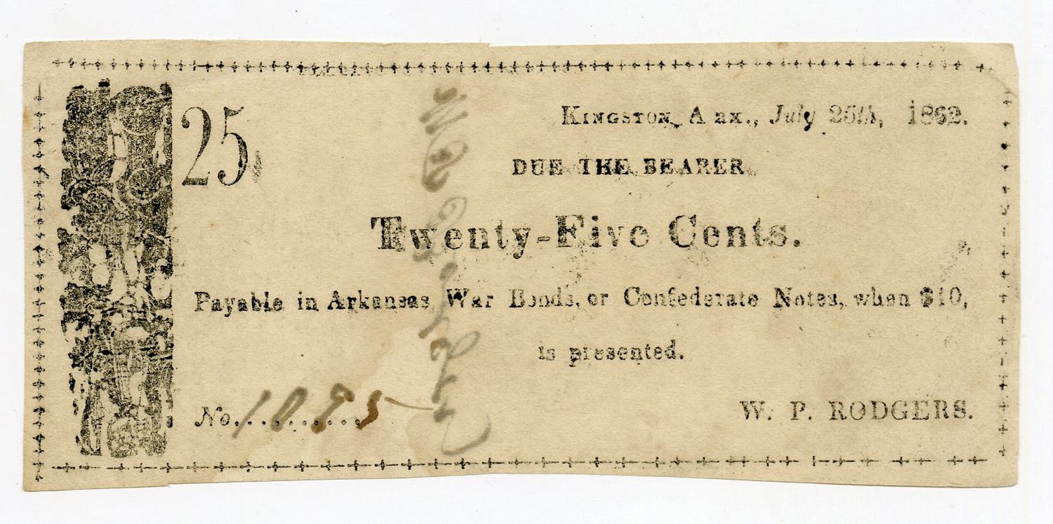 Kingston, Arkansas. July 25, 1862, W.P. Rodgers. 25 Cents, (Possibly Rothert 351-1, but he did not have an image available), Issued obsolete scrip note, Dated July 25th, 1862, Black text on face "Payable in Arkansas War Bonds or Confederate Notes when $10, is presented", with faded black design at left, Ink bleed from signature on back, S/N 1095, Crisp XF condition with a diagonal fold keeping the note from AU condition, with ink bleed from signature on back. Rarity 7 in Rothert. The only example offered at auction that could be found was a inferior example of a 50 Cents denomination note for this issuer.