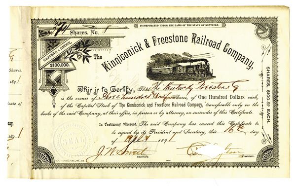 Kentucky. 374 Shares Capital Stock Issued Certificate, Black print on black border, Locomotive moving down tracks at top under company title, Low serial number-8, Cancelled by Presidents name cut out, VF-XF condition, W.R. Carpenter & Co. Only 7 certificates of this kind known..