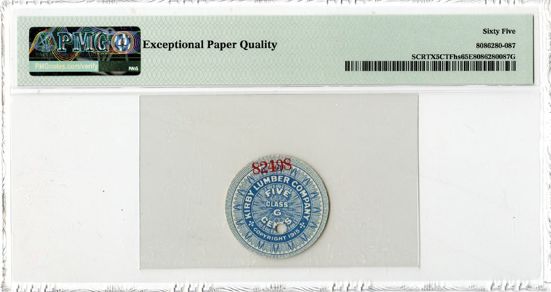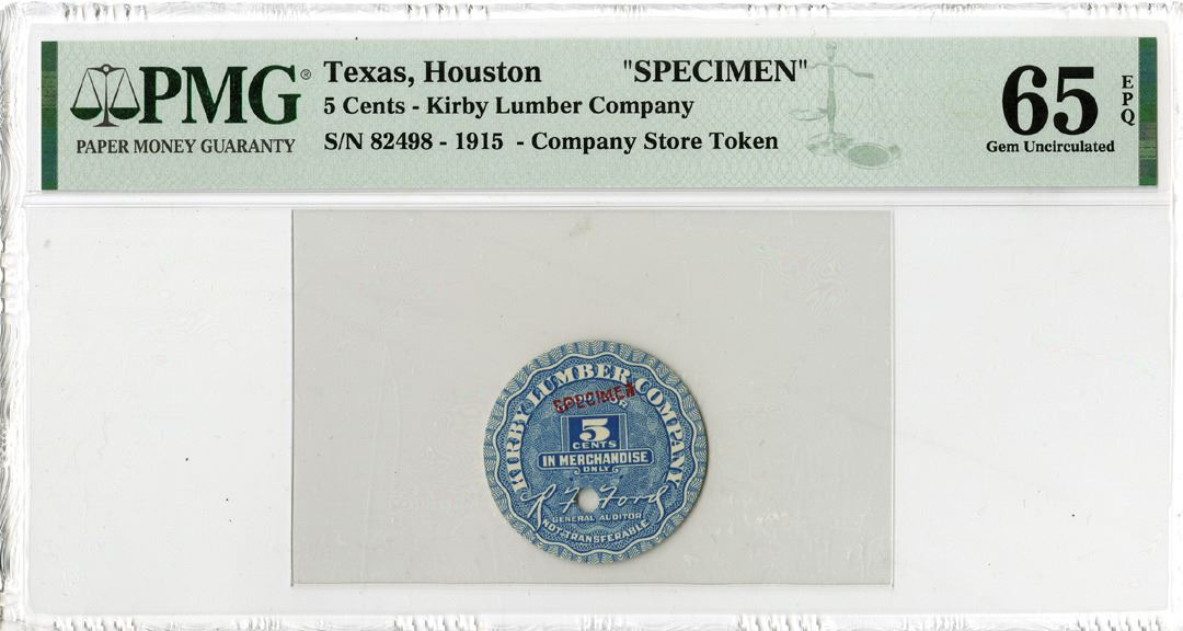 Houston, Texas, 1915. 5 Cent, Specimen Company Store Token printed on thin cardboard. Intaglio printed, Blue with Specimen overprint and POC at bottom, Order #82498, PMG graded Gem Uncirculated 65 EPQ. ABNC.