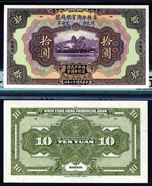 Harbin, China. 1923, $10, P-S1053p (S/M #C76-115) Unlisted face and back proofs, Face is violet on m/c, back is olive green, Printed on planchetted banknote paper, Face PMG graded Choice Uncirculated 64 NET with note of light previous mounting on right back margin, the back is PMG graded Gem Unc. 65 EPQ, attractive note with great eye appeal and colors. ABNC. The only example graded by PMG.