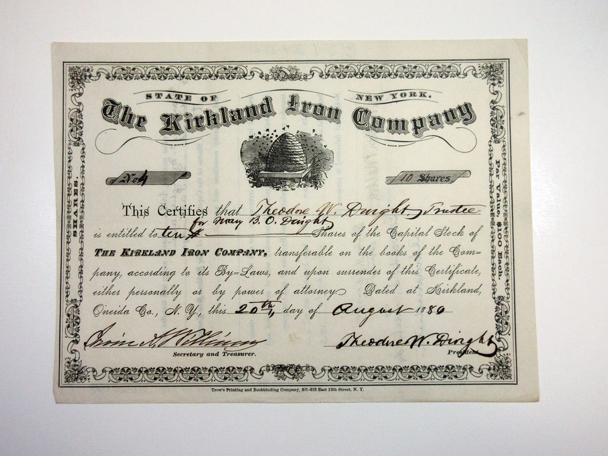 Oneida County, NY. Kirkland Iron Co., 1880 10 Shrs I/U Stock Certificate XF, Trow's Printing, Kirkland Iron Company was a New York company.