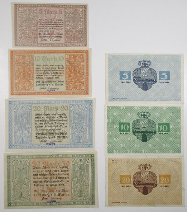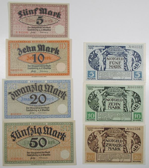 Germany. 1919, Lot includes from Kitzingen a trio of 5, 10, and 20 Mark Notgeld; and from Landsberg a.d. Warthe a quartet of 5, 10, 20, and 50 Mark war Notgeld. XF to AU. (7)