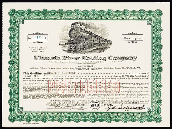 Reno, Nevada. 1927, 5 Shs, Issued and Uncancelled, Locomotive R-L passing tracks, Green border, Preferred stock, Cert.#16P, XF condition, Possibly a railroad related company.