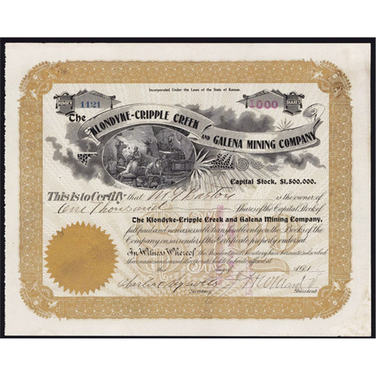 Colorado and Alaska, 19xx (1898-1910) (The date was left off but the certificate was fully issued), 1000 Shares, Issued and Uncancelled stock certificate, Gold border with Mining scene vignette, Company seal, VF condition, attractive mining stock.