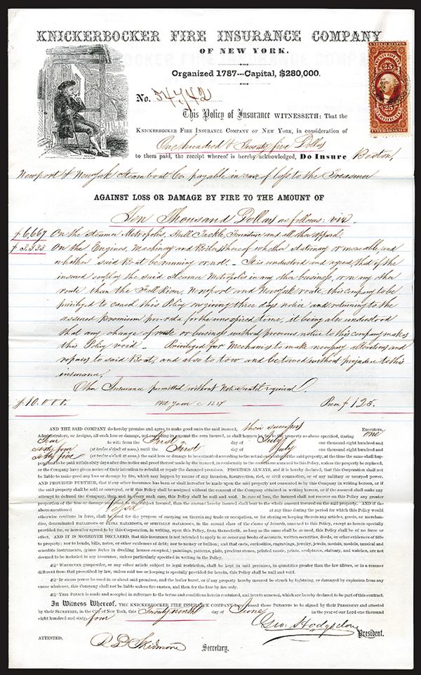 New York, 1860, $10000 Issued Fire Insurance Policy on Boston, Newport and New York Steamboat Co., #54442, $125 policy, Man with pipe sitting top left, VF condition, W. Howland. 25c red Washington Revenue Stamp.