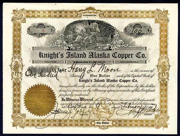 Alaska, (Inc. in Washington) 1907, I/U Stock, #4, 100 Shares, Black on gold border and underprint, Mining vignette top center, VF condition with vertical creasing from folds, Goes.