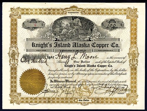 Alaska, 1907, I/U Stock, #4, 100 Shares, Black on gold border and underprint, Mining vignette top center, VF condition with vertical creasing from folds, Goes.