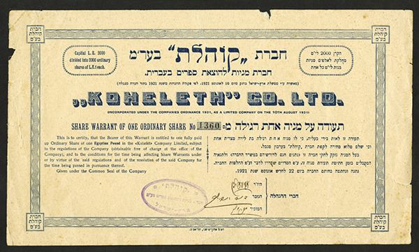 Palestine. Warrant for one ordinary share of E£1, 1921, ornate border, text in English and Hebrew, blue, lacks coupons, some edge damage. Fine